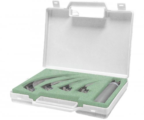MC-INTOSH LARYNGOSCOPE FIBER-OPTICKÝ SET - Vyrobená z nerezovej ocele AISI 304. Držiak a lyžice sú vzájomne zameniteľné. Sada obsahuje lyžice veľkosti 0, 1, 2 v puzdre.