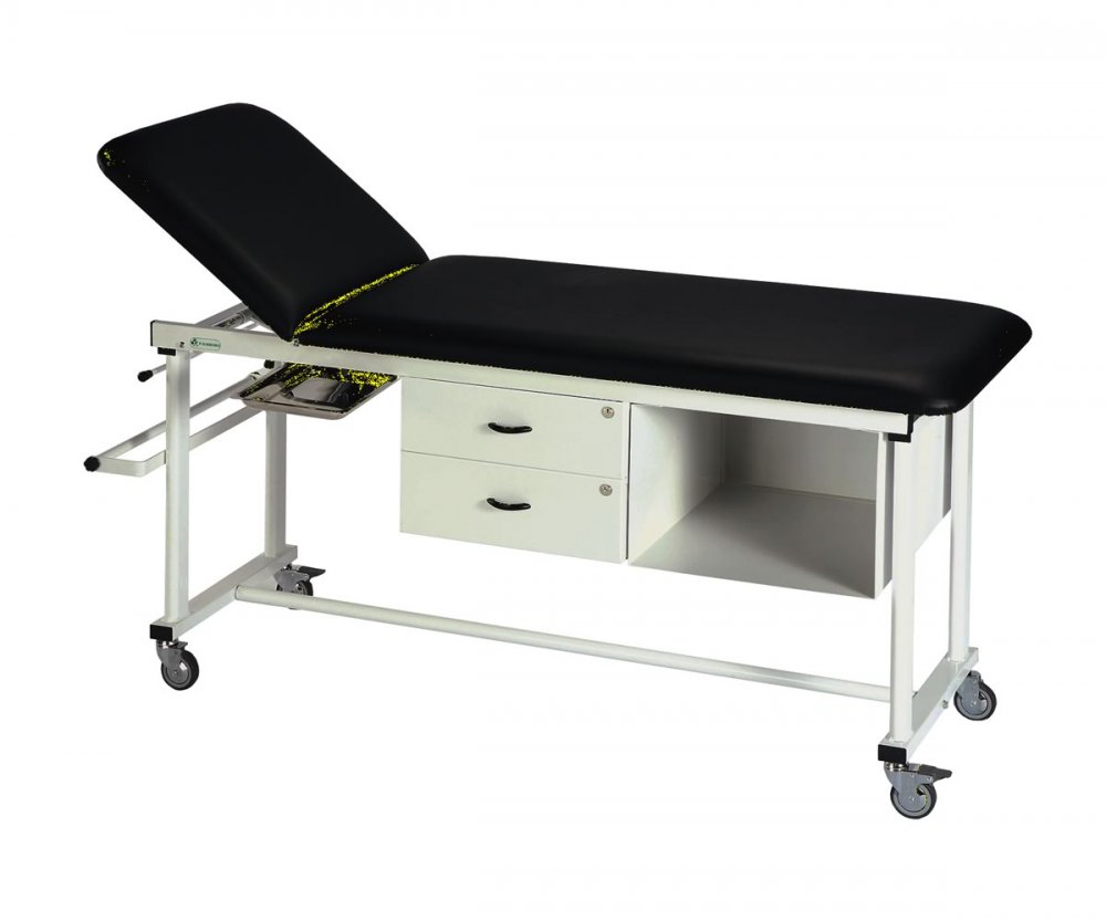 Vyrobené z lakovaných oceľových trubiek, povrch lehátka je polstrovaný a pokrytý umývateľným materiálom, kompletný s 2 policami, držiakom papierovej rolky a nerez podnosom, na kolieskach ø 80mm s brzdami.